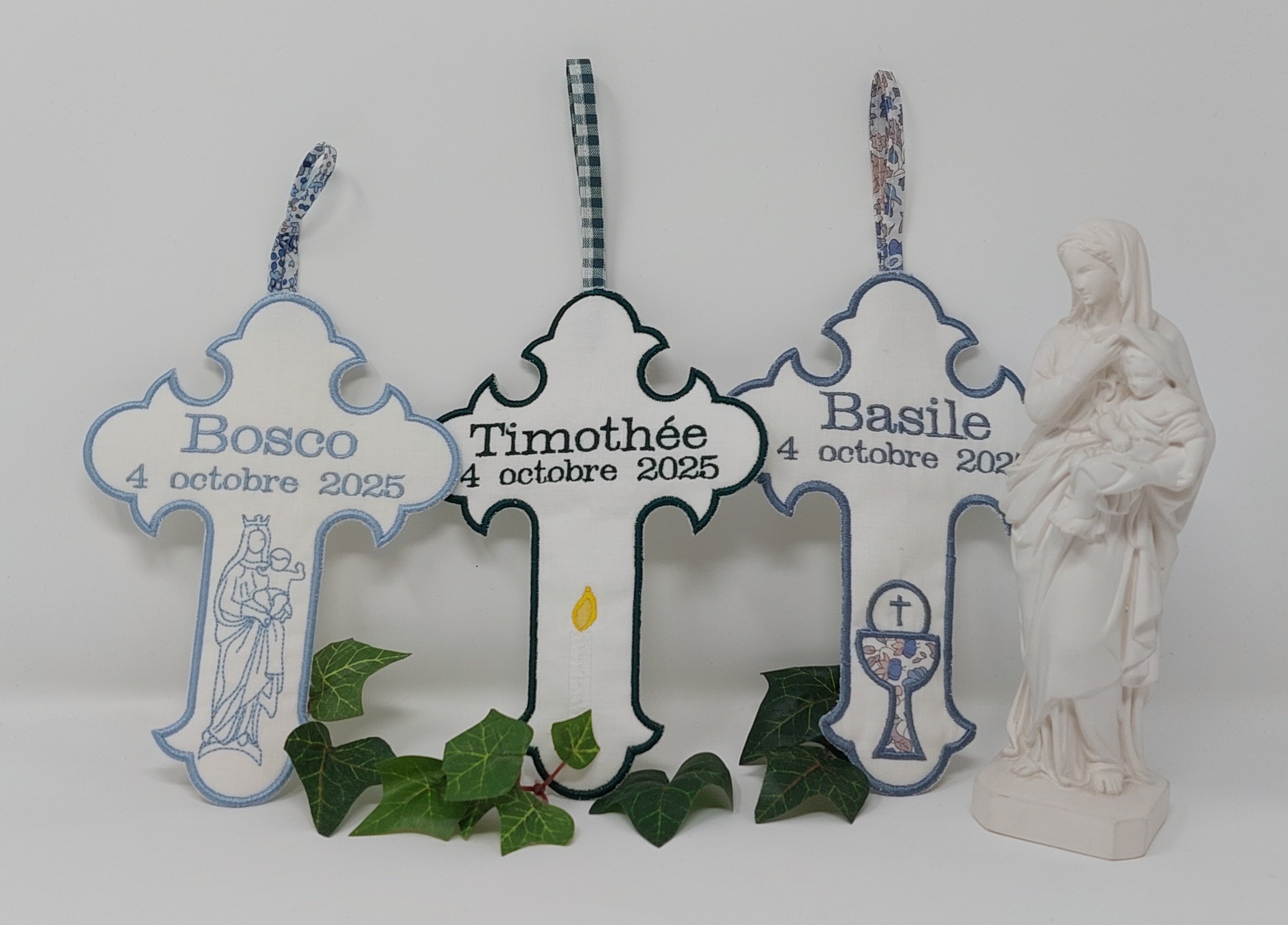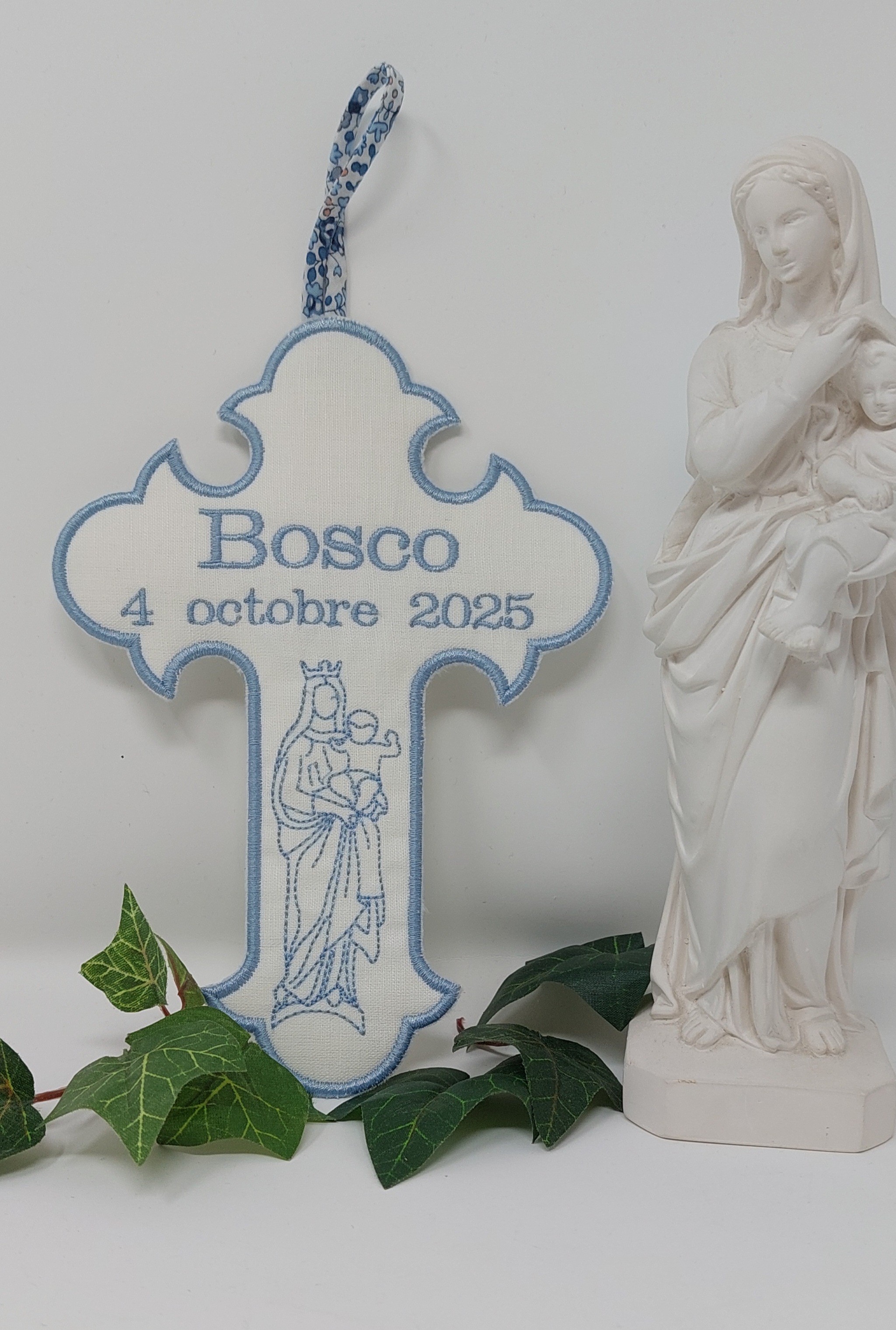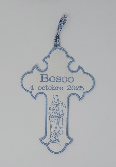Une jolie croix brodée sur un tissu délicat blanc,ornée d'une Vierge à l Enfant.