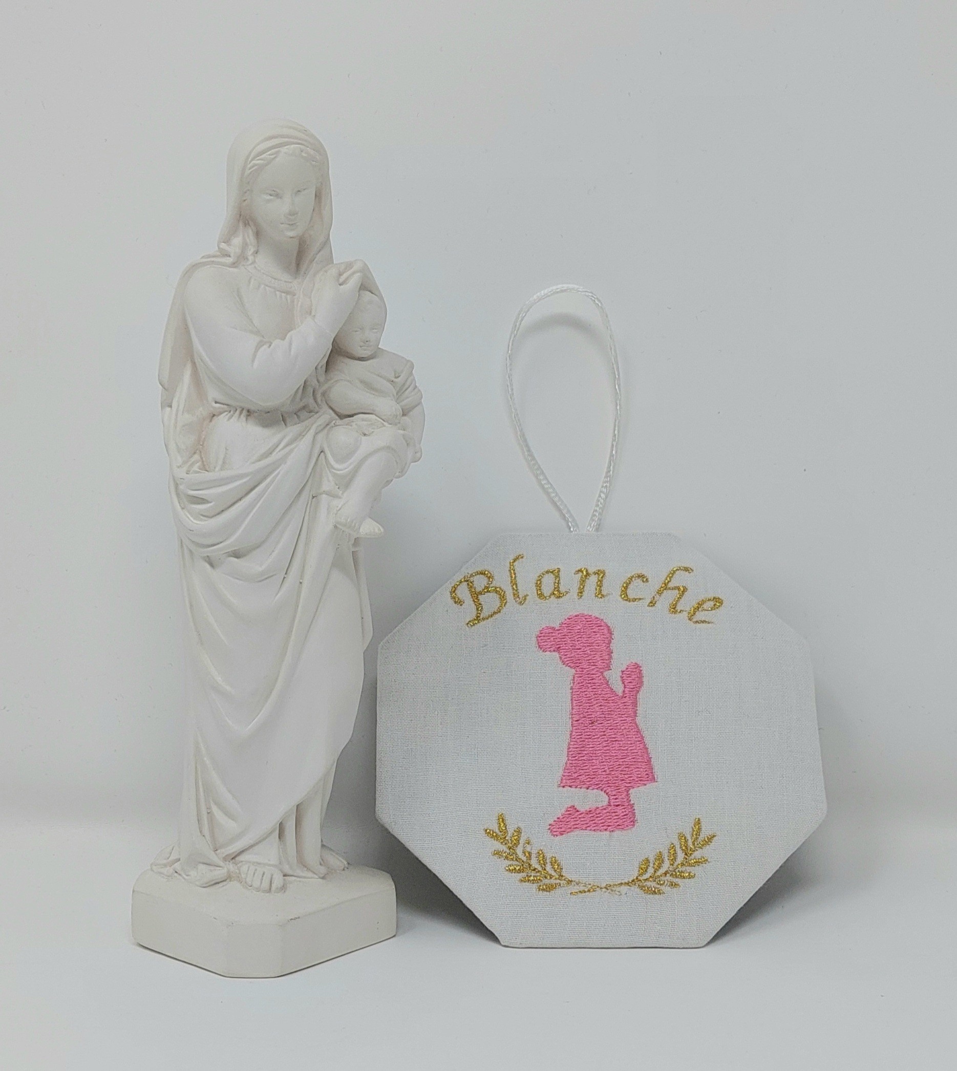 Un cadre hexagonal brodé sur coton au prénom de l'enfant, avec une jeune fille en prière ou un garçon en prière.